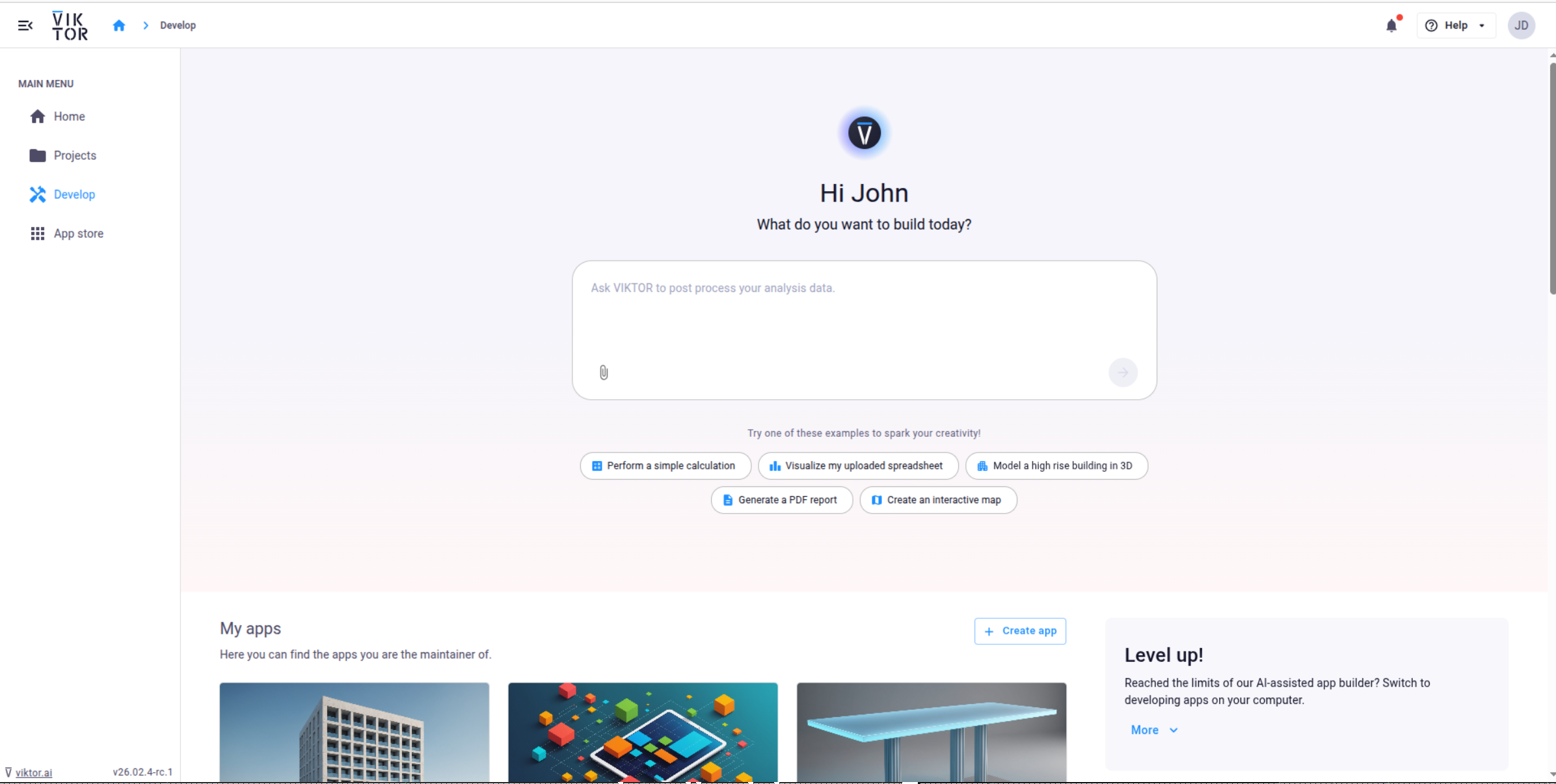 You can create new apps using the App Builder directly from the Develop page in the VIKTOR environment.
