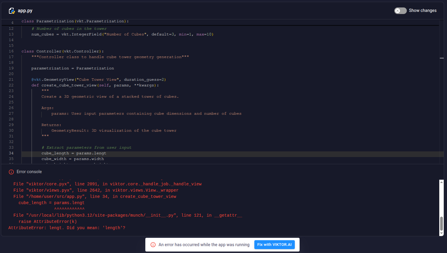You can ask the AI assistant to fix the error for you by clicking the 'Fix with VIKTOR.AI' button. The AI assistant can also help explain why the error occurred.