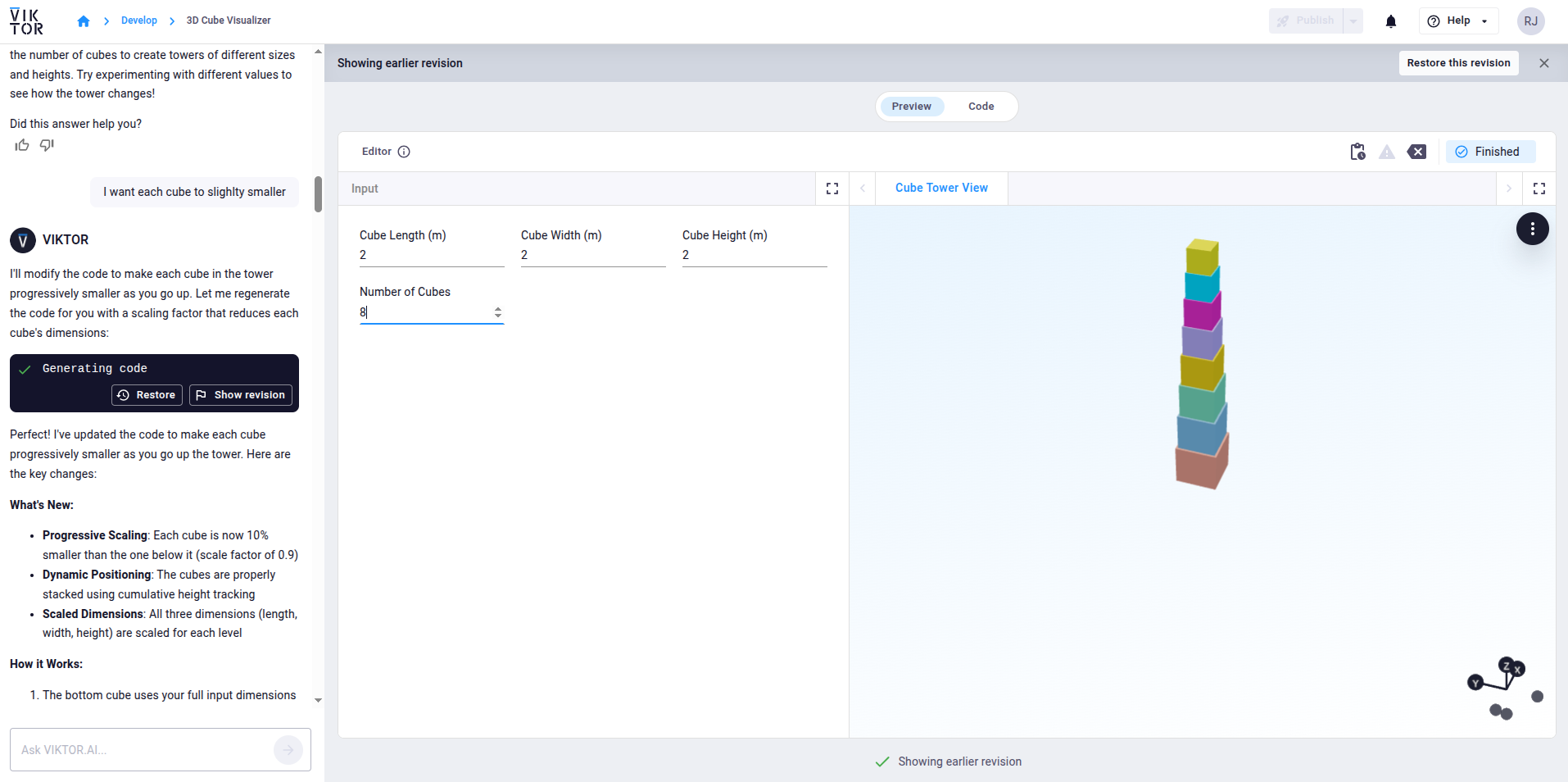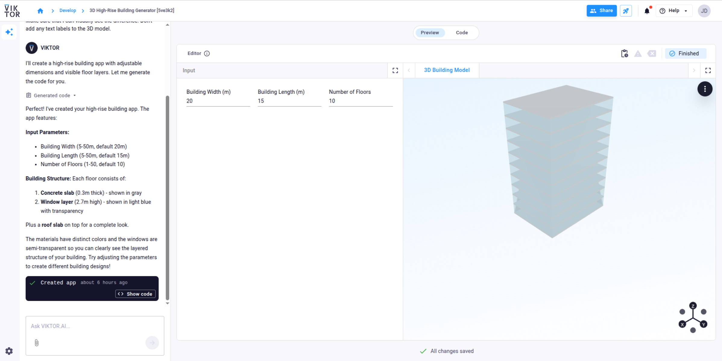 The App Builder is your AI-powered coding assistant, designed to help you create VIKTOR apps quickly, all from your browser. It features a browser-based chat interface and a development environment. This eliminates the need for any local software installation, allowing you to go from an idea to a working app in seconds with our AI assistant as your pair-programmer! The AI assistant updates your app based on your prompts, but you can also make manual changes directly in the code editor. A real-time preview of your app is available, allowing you to see changes instantly. Once you're satisfied with your app, you can deploy it to your environment with a single click!