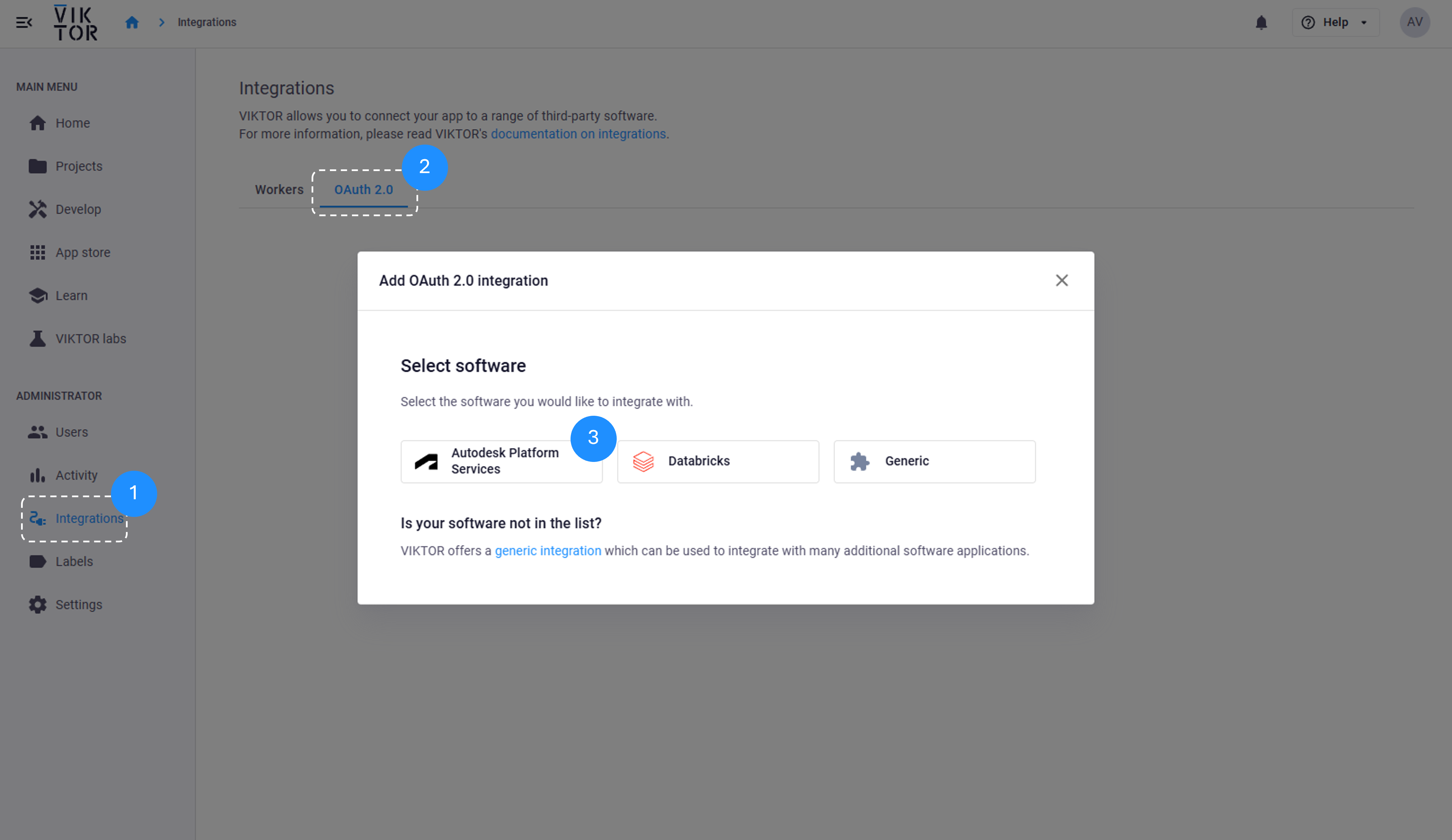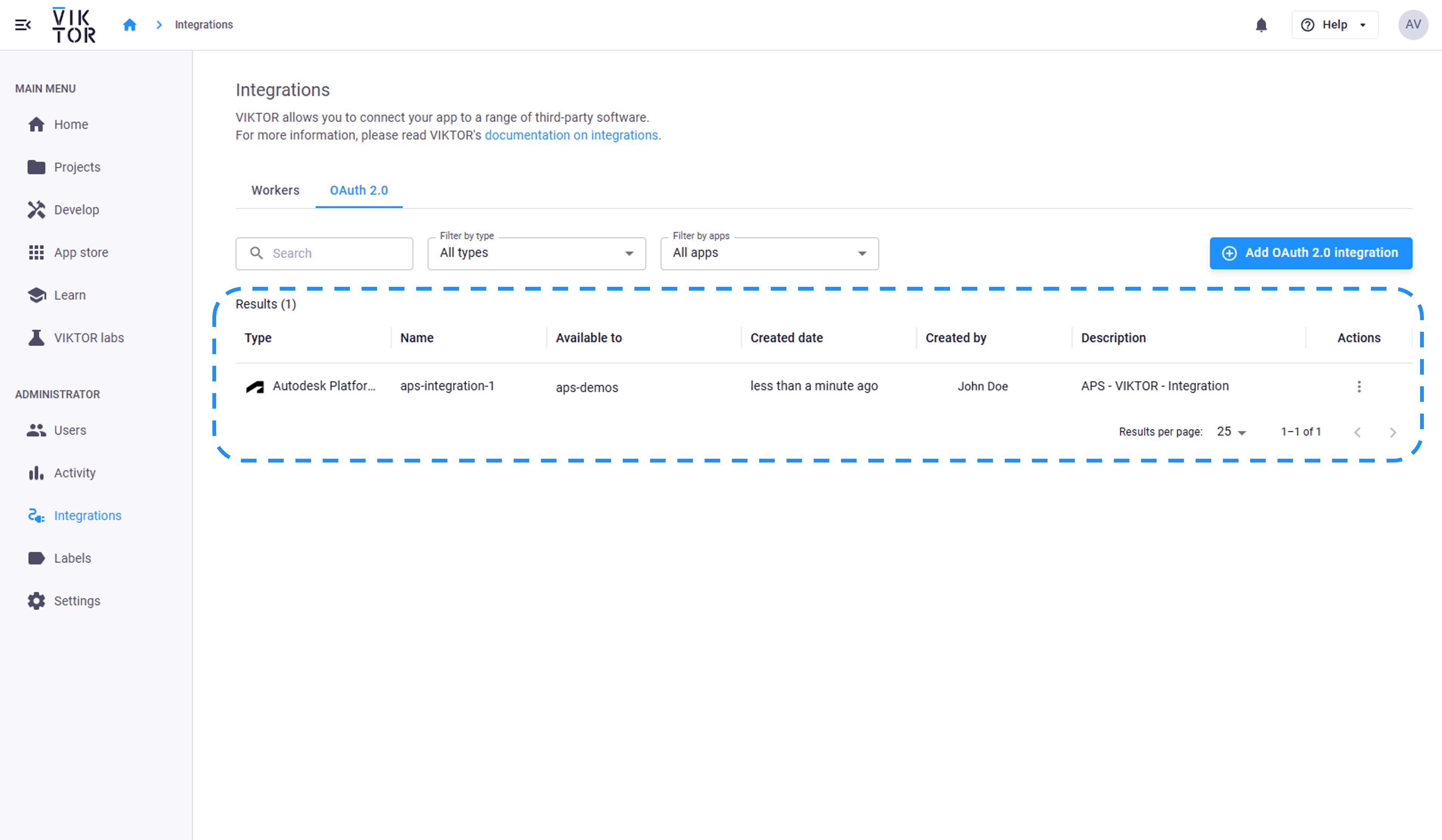First, an OAuth 2.0 integration must be set up by a VIKTOR admin. This must be done in APS and in VIKTOR, following these steps: