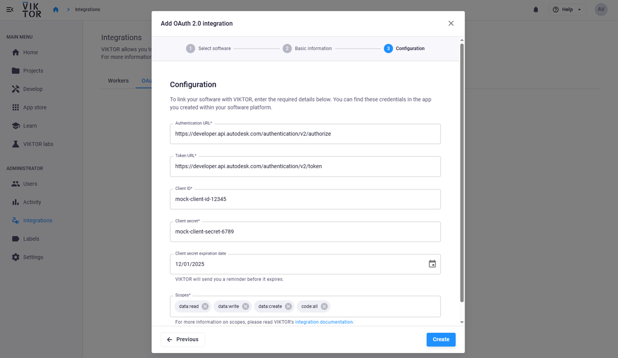 Use the minimum scopes required for your application to function when creating the integration in VIKTOR. This limits the impact in case of misuse.