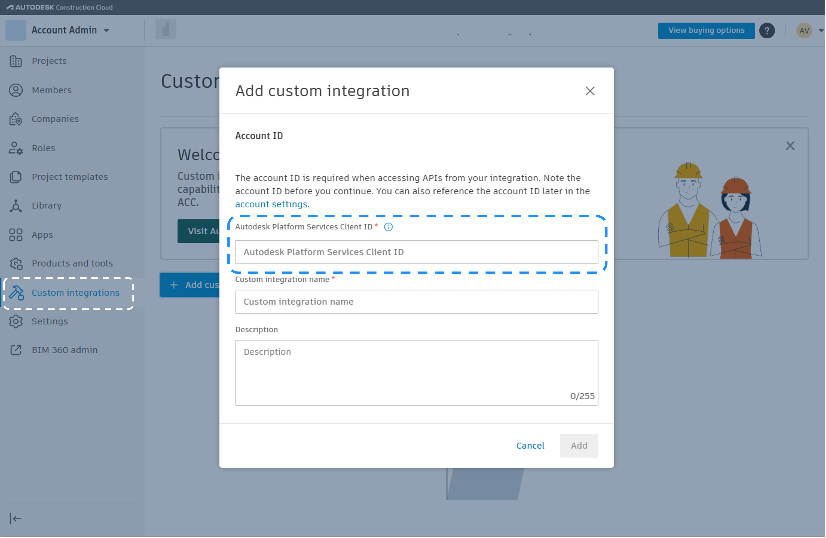 The user must be an Account Admin to add the app integration. Follow these steps to connect your APS application to your ACC projects:
