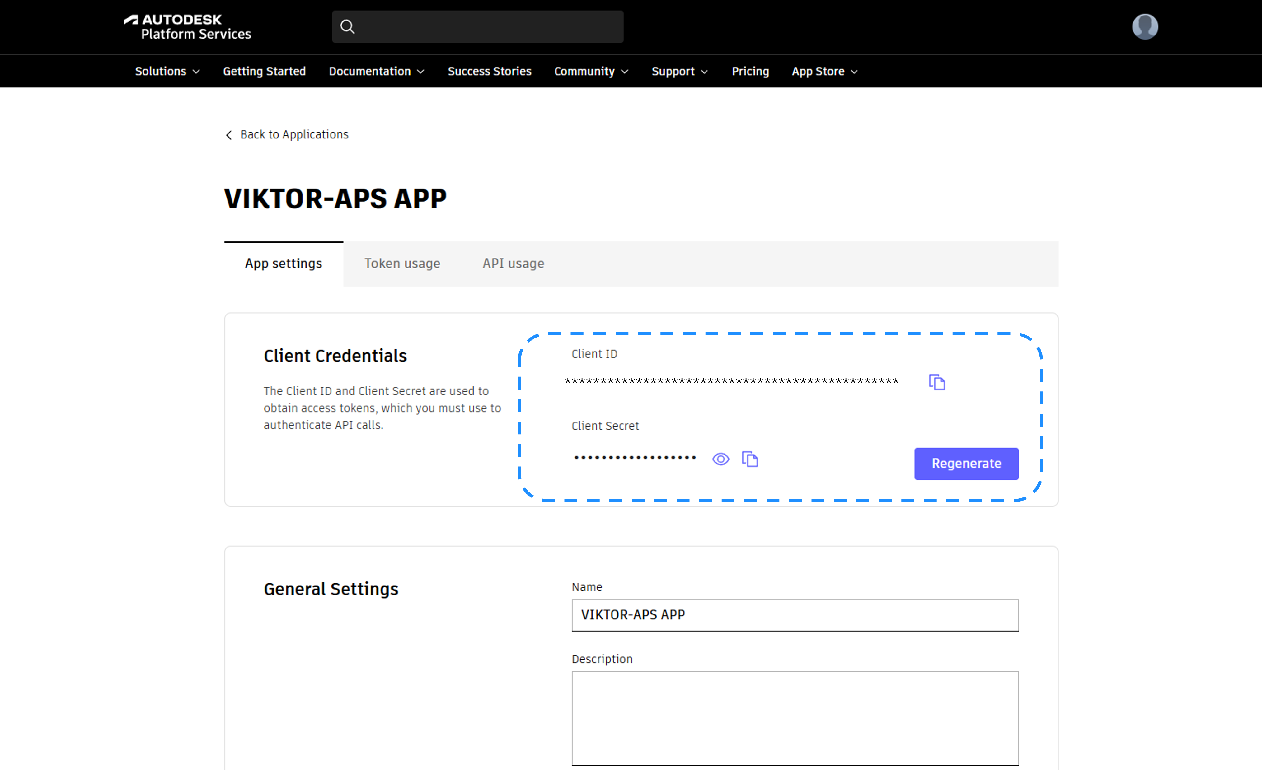 In the APS application, open App settings and copy Client ID and Client Secret into the VIKTOR modal from step 3.