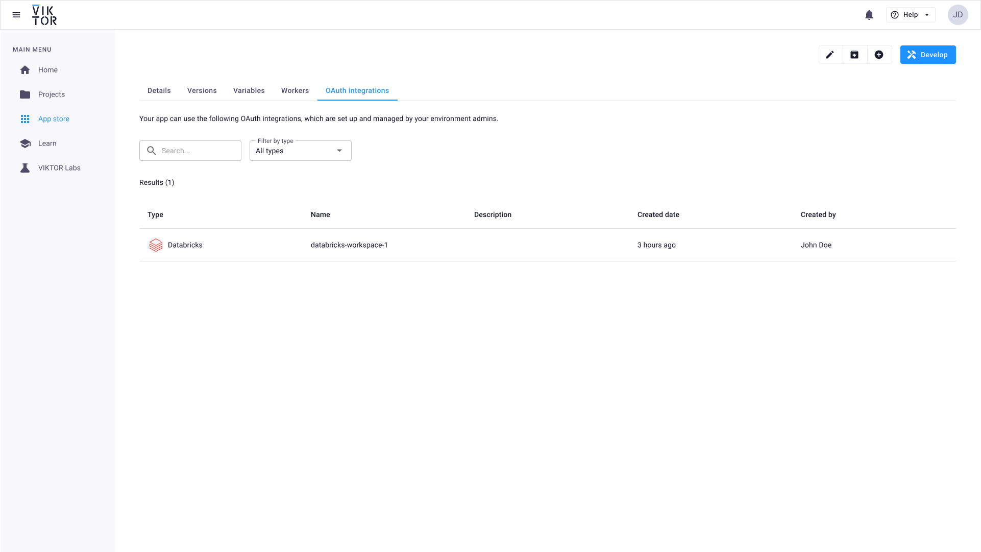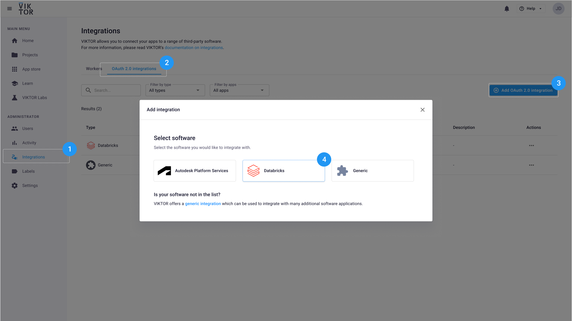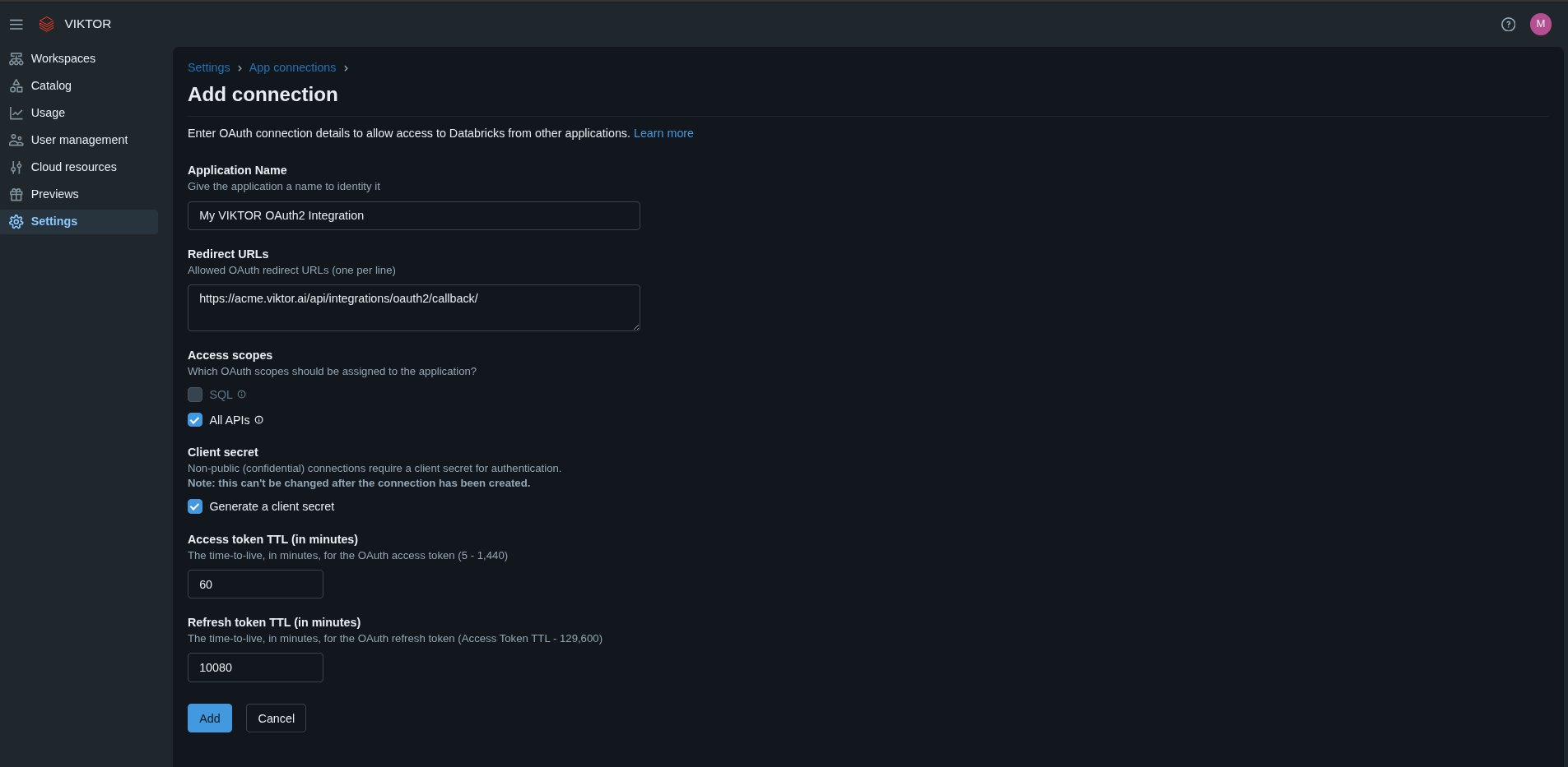 First an OAuth 2.0 integration needs be setup by one of the VIKTOR admins. This needs to be done in Databricks and in VIKTOR.