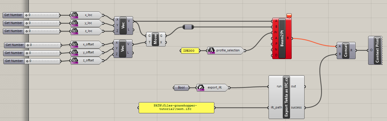 A powerful connection can also be made with the Grasshopper-Tekla link. Tekla structures are easily created with Grasshopper and the GH-components available. When creating a VIKTOR - Tekla app, Grasshopper can also be used. The main issue is that we want a .ifc from the Tekla model; and Grasshopper nodes don't allow for saving / export Tekla files. This can be solved like this: