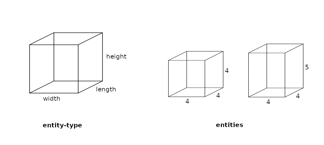 For example, an entity-type 'Cube' might be defined by its width, length and height. A 3 x 3 x 3 cube would be an entity of the type Cube, just as a 4 x 4 x 4 cube would be an(other) entity of the same type.