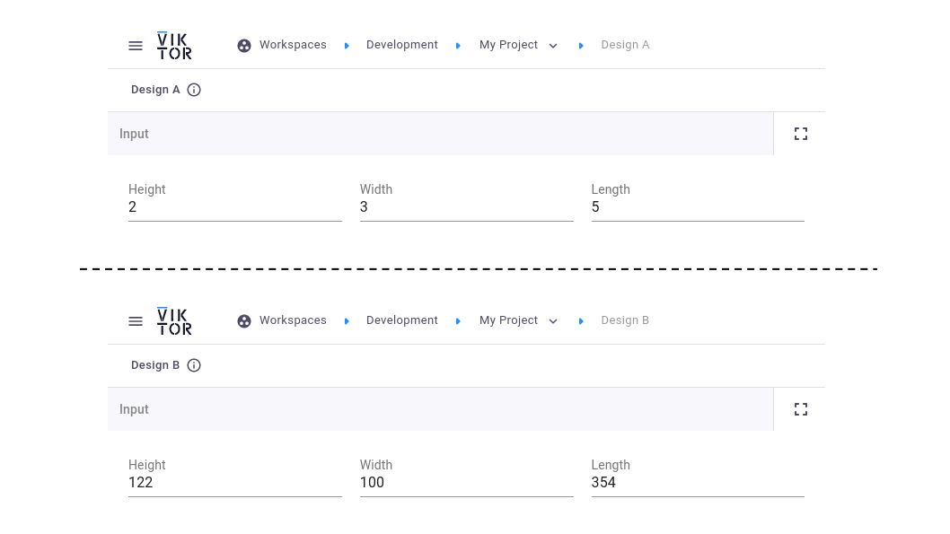 Entities 'Design A' (top) and 'Design B' (bottom) have equal parametrization but differ by value