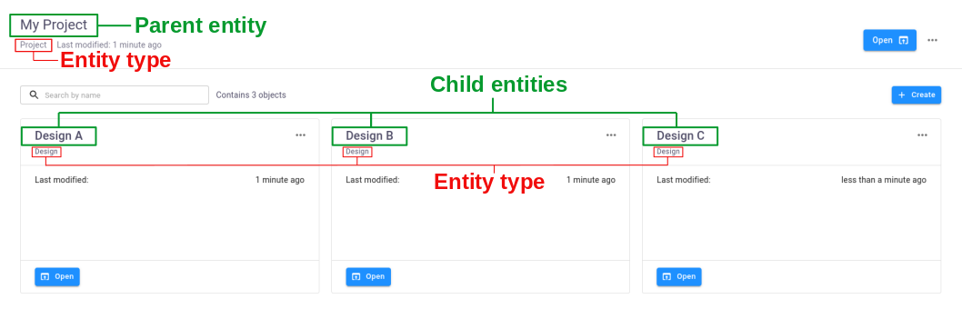 The figure below shows a snapshot of the current live application, as seen by the user. We can see that the user created an entity of type 'Project' (and named it 'My Project'). Within the created project, the user created 3 entities of type 'Design' (notice that 'Design' is its label seen by the user) and named them 'Design A', 'Design B', and 'Design C' respectively.