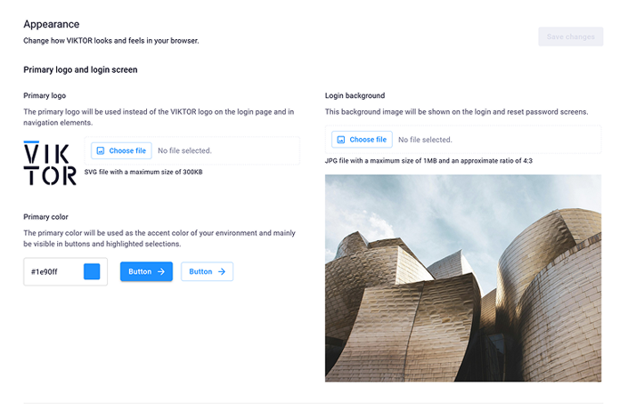 Opening Settings > Appearance leads to a configuration page on which the admin can adjust the global theme of the company environment. This includes customization of the following elements: