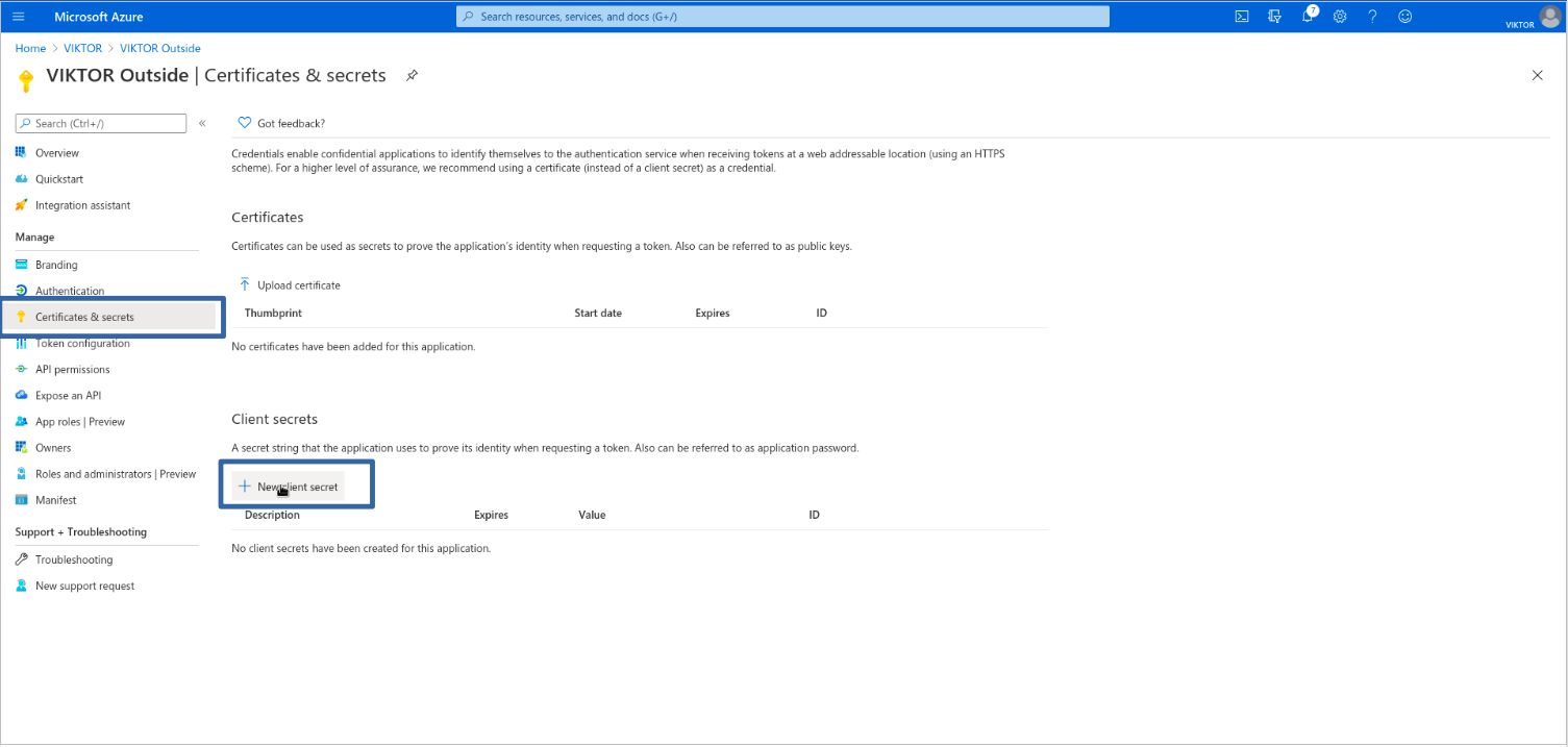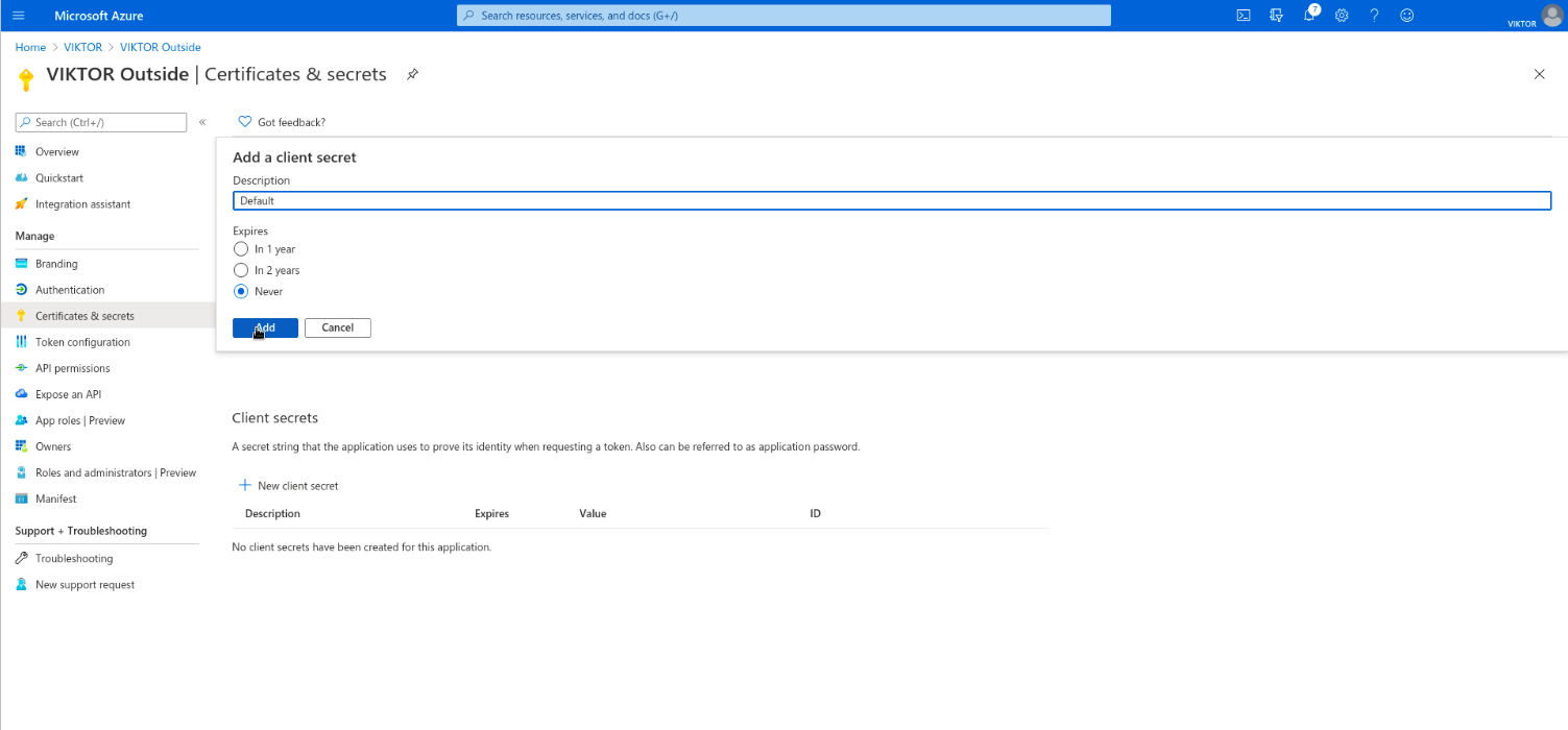 Last, you need to create a client secret for your VIKTOR application to prove its identity when authenticating the user. Go to "Certificates & secrets" and add a client secret. Use description "Default" and expiration "Never". Copy the value of the secret for later use.