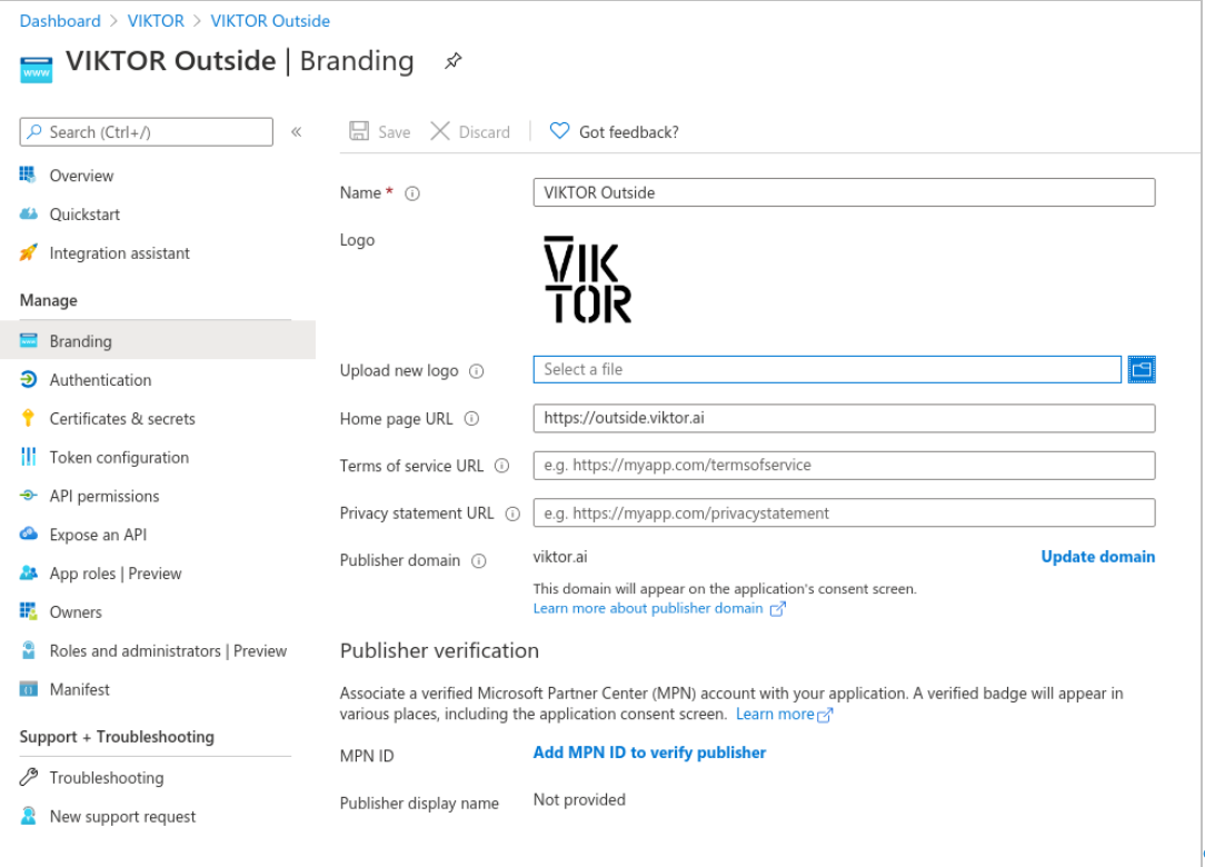 "Branding". Here we have configured our application’s Home page URL. This value should be your VIKTOR application