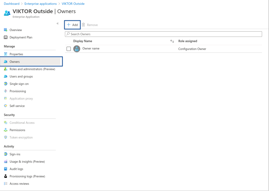 To allow other users to configure and maintain the application, you can assign them as Owners. Go to Owners > Add and select the desired users.