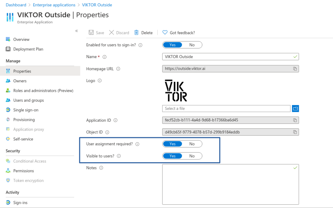 At this point the VIKTOR App is registered in your Microsoft Entra ID and can be used. To manage operational settings go to "Enterprise Applications" from the Microsoft Entra ID main page and search for "VIKTOR". Below you can find some settings you might want to consider.