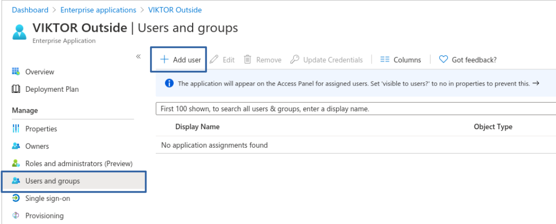 By default, your Microsoft Entra ID application will be configured to allow all your users to sign in. To allow only selected users to sign in, navigate to "Properties" and enable "User assignment required". If you want the application to be visible to the assigned users in their Access Panel and the O365 app launcher, also enable "Visible to users".