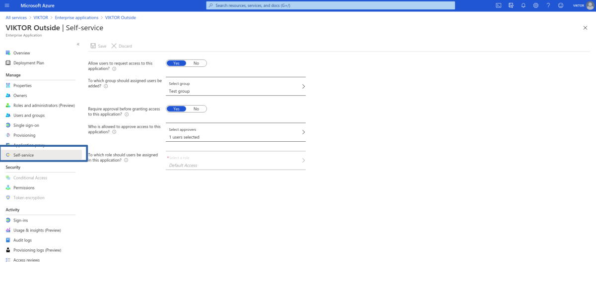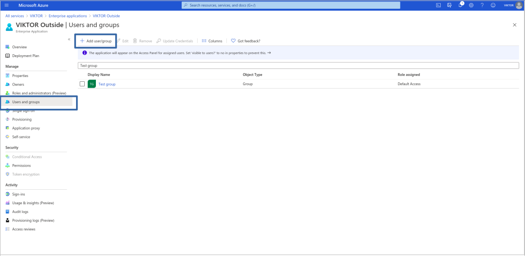 To enable self-service you first need to create a group and assign it to your application. All user that will be approved to use the application via self-service will land in this group, thus acquiring access for your application. First go to "Groups" from the Microsoft Entra ID main page and create a "New group". In our case, we created a group called "Test group". Then go back to the Microsoft Entra ID main page, select "Enterprise applications", find your "VIKTOR" application and open "Users and groups". From this screen, assign the group you just created to your application, as shown below.