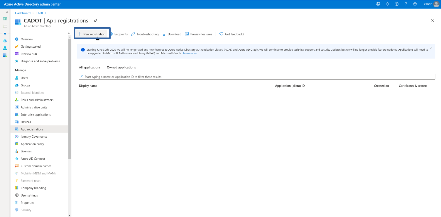 App Registrations > New Registration, as shown in the screenshots below.