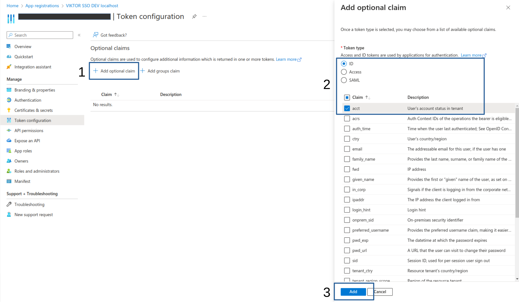 Navigate to "Token Configuration", and click the "+ Add Optional Claim" button. For the Token type, select "ID", then under 'Claim' tick the "acct" option. Confirm your choices by clicking the "Add" button.