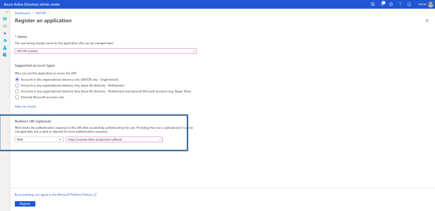 Here we have configured our application’s Redirect URI. If your VIKTOR application is running at