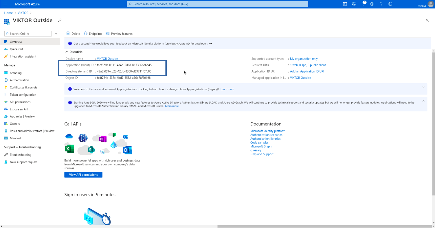 After you have created the new application, you can find its IDs in the "Overview" page, as shown below. The Application (client) ID and Directory (tenant) ID will be used later to setup your VIKTOR application.