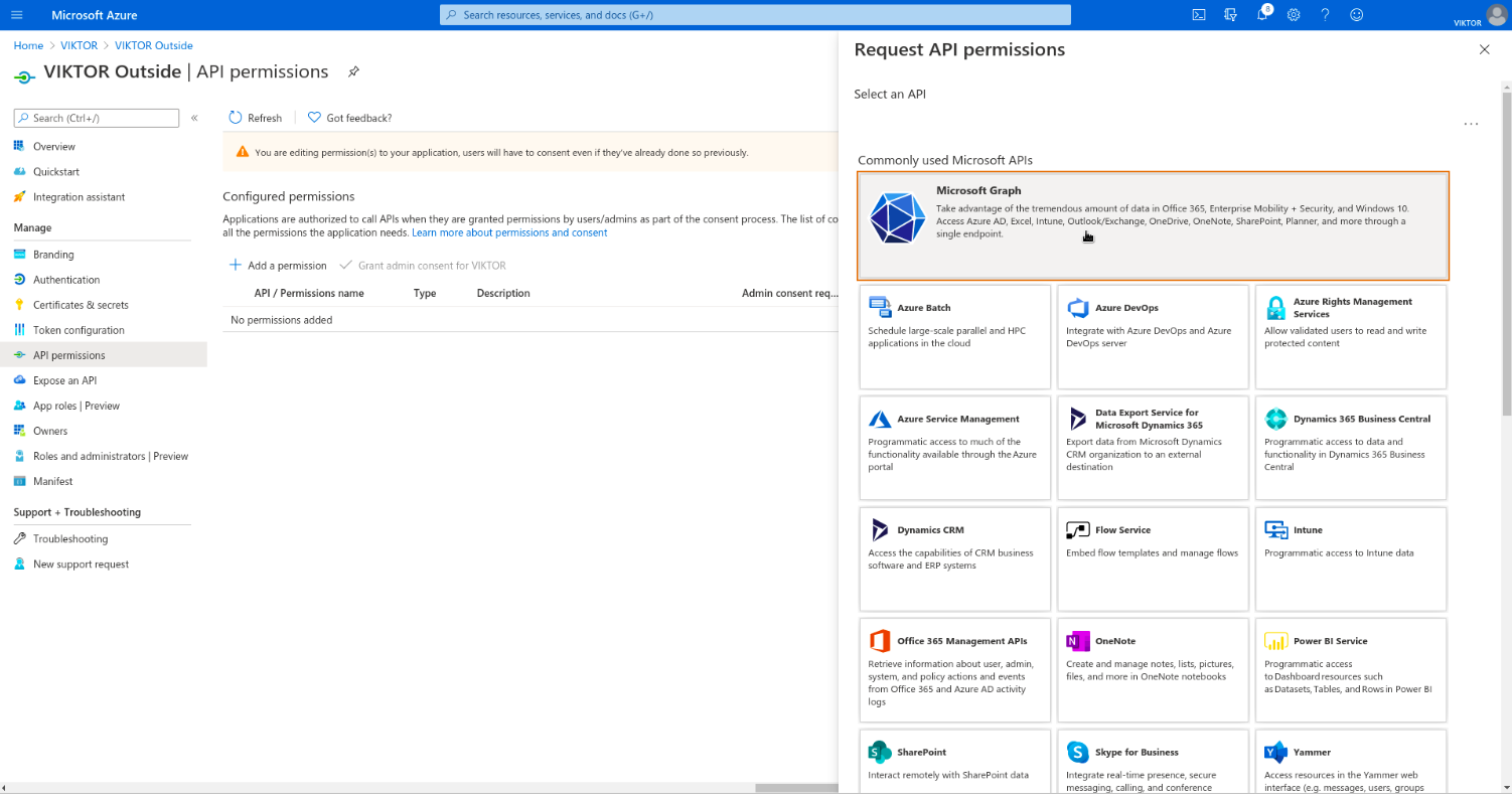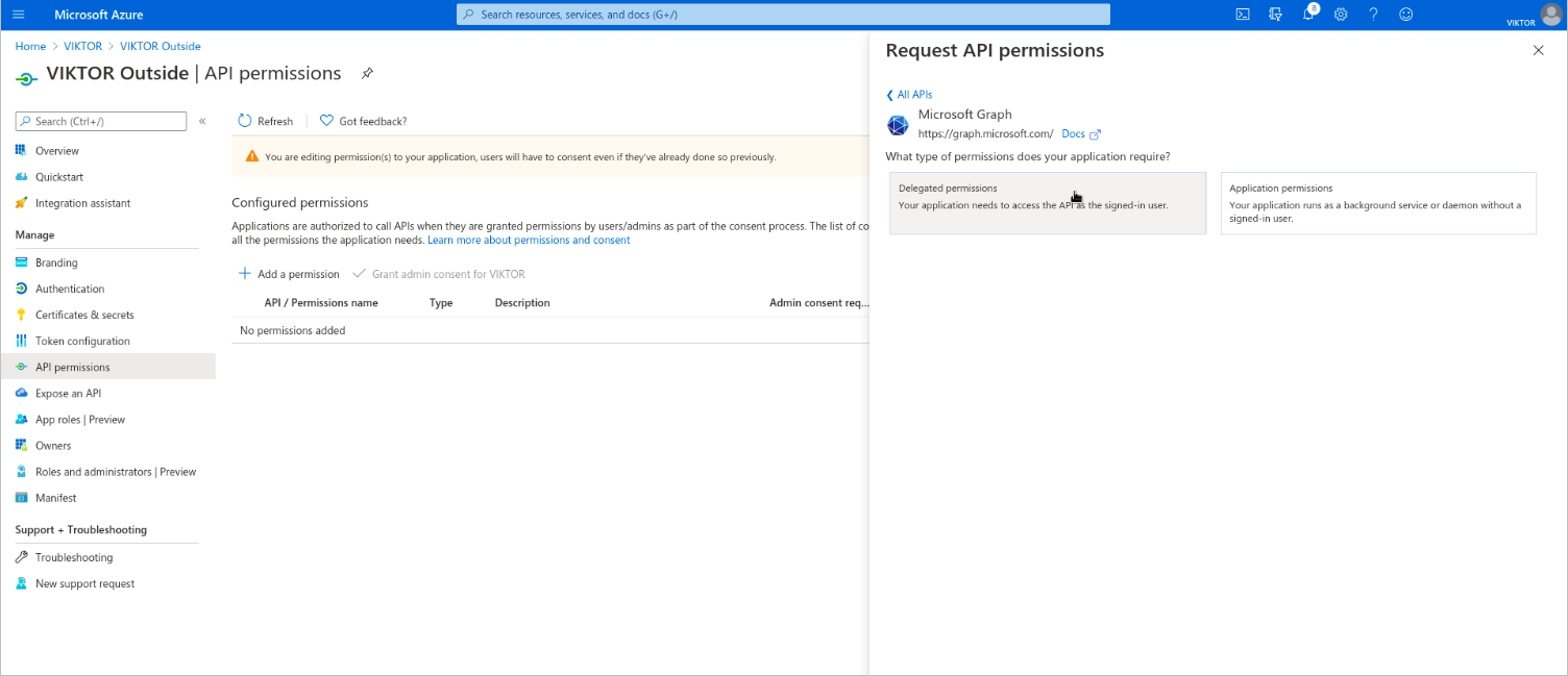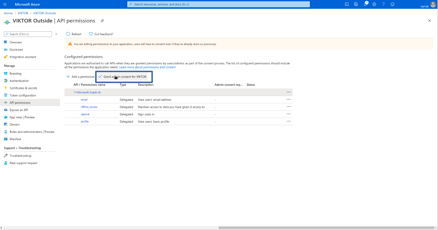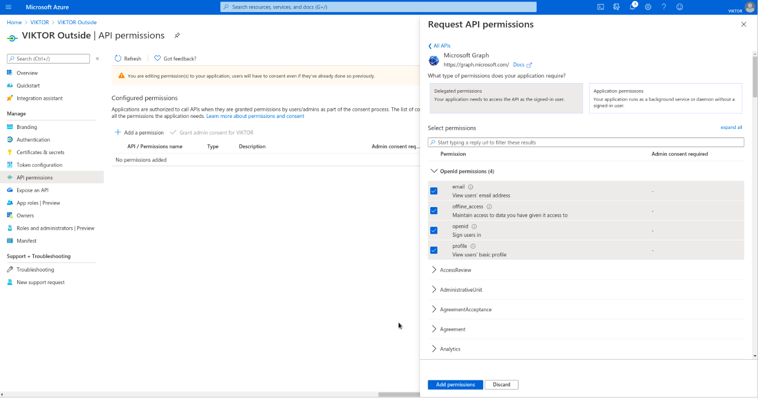Next, you need to enable the required permissions for VIKTOR to be able to read the logged-in user’s basic information and register them to your VIKTOR application, after they have successfully logged in. Go to "API Permissions" and clear existing permissions. Add the required permissions by navigating to: Add a permission > Microsoft Graph > Delegated permissions. Select email, offline_access, openid and profile, and click "Add permissions". Click "Grant admin consent for {tenant}".