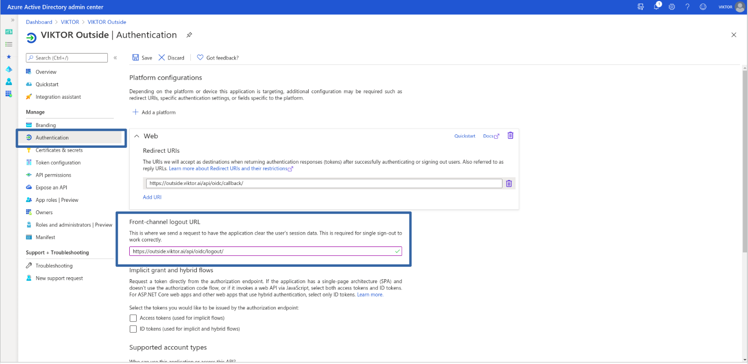 To enable your VIKTOR application to log out a user when they log out from Microsoft Entra ID, you need to specify your