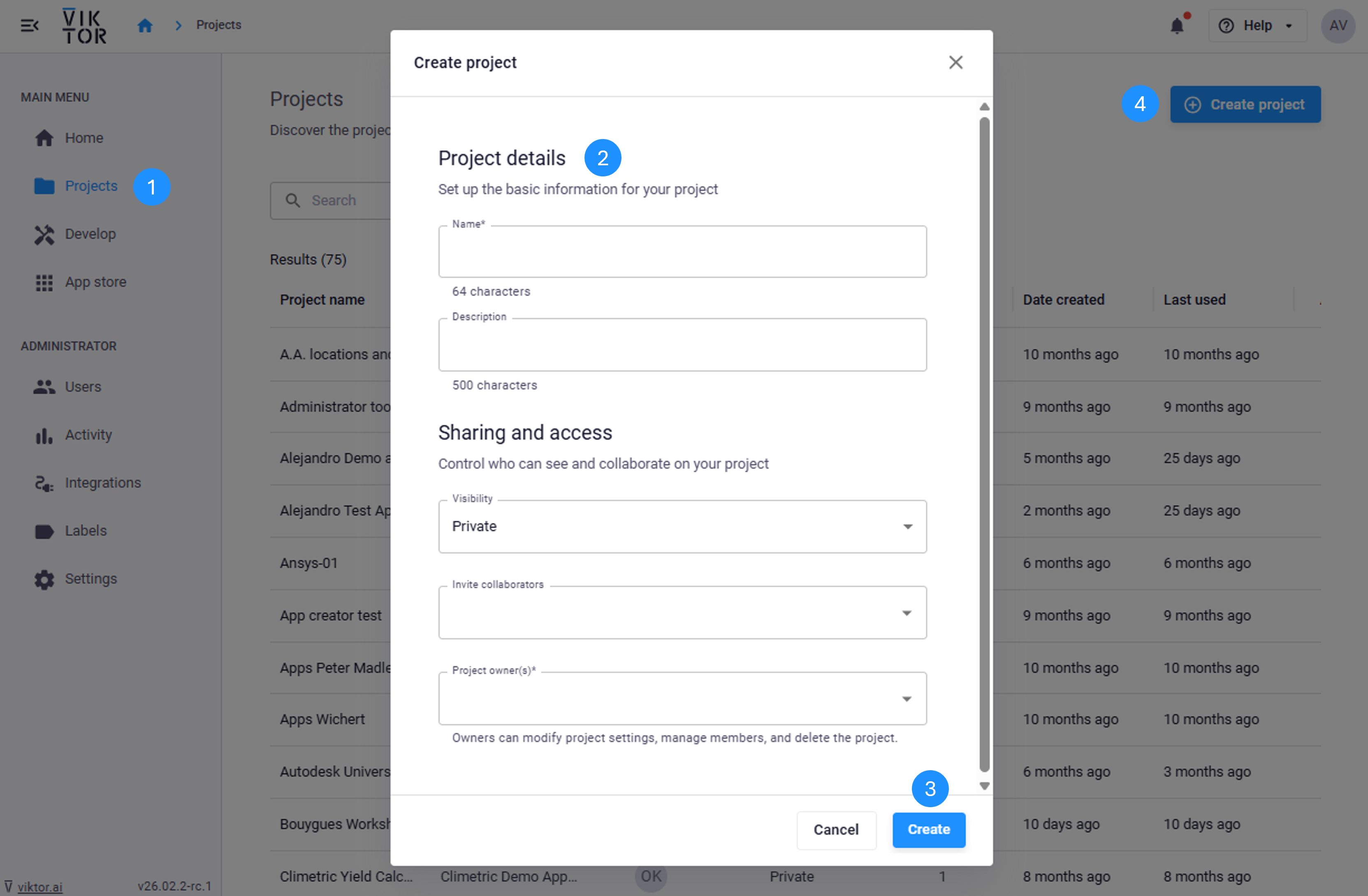 - Navigate to Projects and click on the "Create project" button in the top right hand corner.