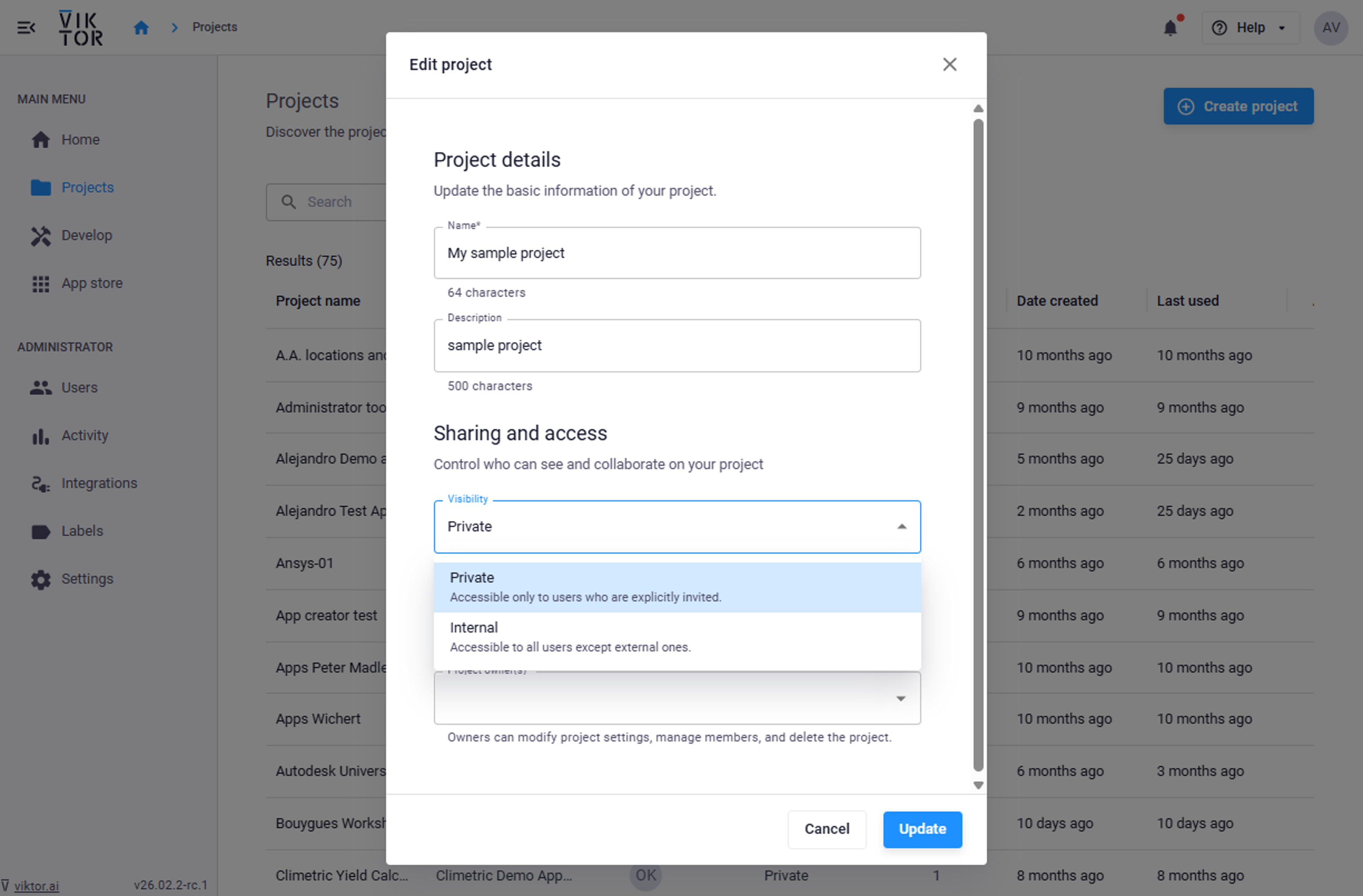 Project visibility can be set during the creation of a project or updated by following these steps: