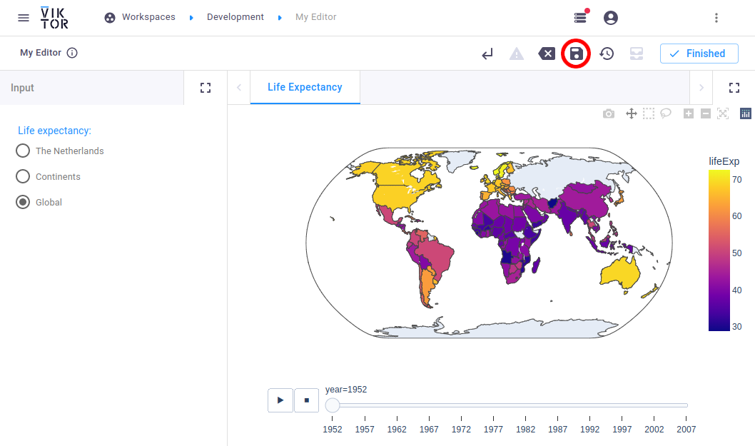 On the left side, you will now see radio buttons with the defined options. Go ahead and select another option and see how it influences the results on the right-hand side. Save your changes by clicking the disk icon in the top-right corner of the screen (encircled in red in the image below).