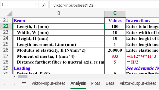The values from viktor-input-sheet should now be used in the Analysis sheet. For example, cell C22 below refers to