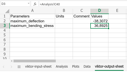 In the viktor-output-sheet the desired output parameters are defined, with their values taken from the Analysis